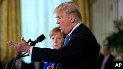 جمعے کے روز ٹرمپ کے ساتھ ملاقاتوں کے بعد،جرمن چانسلر آنگلہ مرخیل اخباری کانفرنس میں ٹرمپ کے ہمراہ موجود تھیں۔