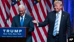 ری پبلیکن پارٹی کے متوقع صدارتی امیدوار ڈونالڈ ٹرمپ اور اُن کے نائب صدارتی امیدوار، انڈیانا کا گورنر مائیک پینس ہفتے کے روز نیویارک کی ریلی میں ایک ساتھ نظر آئے، جن کے بارے میں ٹرمپ کا کہنا تھا کہ ’’یہ میری انتخابی مہم کے ساتھی ہیں‘‘۔