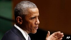 بدھ کو نیویارک میں اقوام متحدہ کی جنرل اسمبلی سے خطاب کرتے ہوئے، مسٹر اوباما نے کہا کہ سر قلم کرکے، بچوں پر گولیاں چلا کر، لاشوں کو اجتماعی قبروں میں ٹھونس کر اور مذہبی اقلیتوں کو فاقہ کشی پر مجبور کرکے، اس شدت پسند گروہ نے عراق اور شام میں بے گناہ لوگوں میں دہشت بٹھا رکھی ہے۔