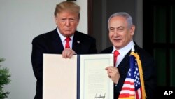 پیر کے روز دورہٴ واشنگٹن کے دوران ٹرمپ اور اسرائیلی وزیر اعظم بینجامن نیتن یاہو ایک ساتھ نظر آئے، جب اُنھوں نے ایک اعلامیے پر دستخط کیے جس کے تحت باضابطہ طور پر امریکہ نے گولان ہائٹس کو اسرائیلی علاقہ تسلیم کیا۔