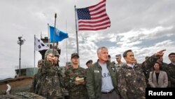 چک ہیگل نے پیر کو اپنے چار روزہ دورہِ جنوبی کوریا کا آغاز کیا اور شمالی کوریا کی سرحد پر واقع ’ڈی ملٹرائزڈ زون‘ یا (ڈی ایم زیڈ) نام سے جانا جاتے علاقے کا دورہ بھی کیا۔