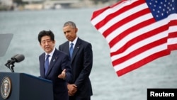 پرل ہاربر اڈے پر منعقدہ تقریب میں آبے امریکی صدر براک اوباما کے ساتھ کھڑے ہوئے۔