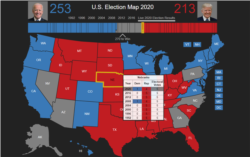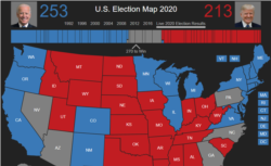 غیر سرکاری و غیر حتمی نتائج کے مطابق جو بائیڈن 253 اور ڈونلڈ ٹرمپ 213 الیکٹورل ووٹ حاصل کر چکے ہیں۔