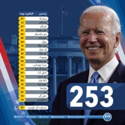 امریکہ کے صدارتی انتخاب میں کامیابی کے لیے کسی بھی امیدوار کو 538 رکنی الیکٹورل کالج کے کم از کم 270 ووٹ درکار ہوتے ہیں۔ صدر ٹرمپ کے حریف ڈیموکریٹ امیدوار جو بائیڈن اب تک 253 ووٹ حاصل کرچکے ہیں۔