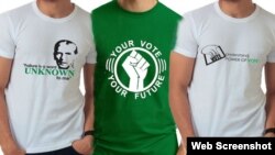 ان ٹی شرٹ پر مختلف عبارات درج ہیں ایک ٹی شرٹ پر تحریر ہے کہ "میرا ووٹ میرا مستقبل ہے"۔ ۔
