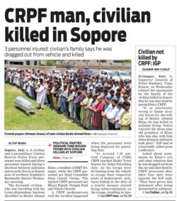 'گریٹر کشمیر' نے صفحہ اول پر کشمیر پولیس کے انسپکٹر جنرل (آئی جی) کا بیان بھی شائع کیا جس میں ان کا دعویٰ تھا کہ شہری بشیر احمد خان سیکیورٹی اہلکاروں کی فائرنگ سے ہلاک نہیں ہوئے۔