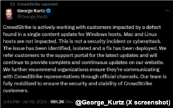 کراؤڈ اسٹرائک کے سی ای او جارج کرٹز کا کہنا ہے کہ ونڈوز صارفین کے لیے پیدا ہونے والے مسائل کو حل کرنے کی کوشش کر رہے ہیں۔