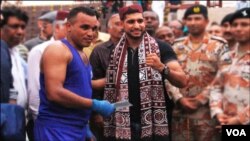رواں ہفتے کراچی کے دورے پر آئے ہوئے پاکستانی نژاد باکسر عامر خان بدھ کے روز لیاری کے اسپورٹس کمپلیکس پہنچے۔ لیاری کے پیپلز اسپورٹس کملیکس میں نامور باکسر عامر خان کا ڈھول کی تھاپ پر خیر مقدم کیا گیا۔